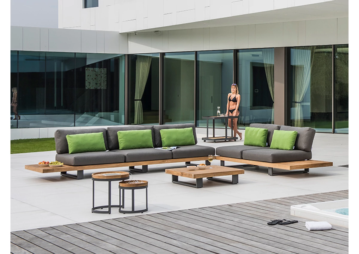 A Truro prémium ülőgarnitúra indusztriális stílusú kültéri ülőbútor. Robusztus megjelenését fém lábai hangsúlyozzák. Letisztult vonalvezetése, stílusos megjelenése miatt minden modern teraszra tökéletesen illik. A könnyű, de nagy teherbírású alumínium elemek modern és letisztult formavilággal rendelkező bútoraink alapanyagai, a teakfa nyers és természetes karaktert kölcsönöz termékeinknek. Az alumínium-teakfa párosítás igazán stílusos és ízléses. Az időjárás viszontagságainak ellenálló szövetek pedig gondoskodnak az ülőfelületek könnyedségéről és kényelméről.