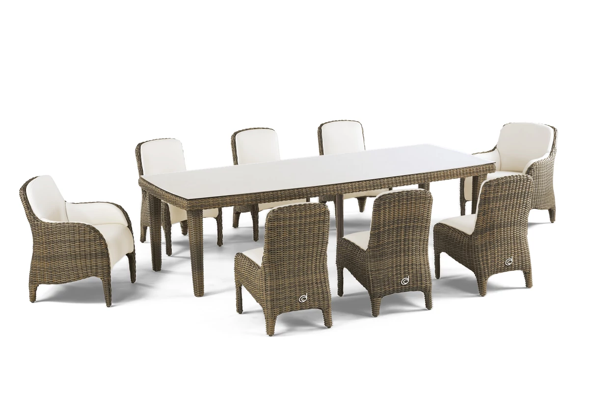 A kézzel fonott polyrattan és az időjárásálló alumínium váz kombinációja nemcsak stabilitást és tartósságot garantál, hanem kifinomult esztétikai élményt is nyújt. A puha párnázott székek maximális kényelmet biztosítanak, így mindenki kényelmesen élvezheti az étkezést és a társaságot. A párnák huzatai könnyedén levehetők és moshatók, így mindig frissen és újszerűen tarthatja őket.